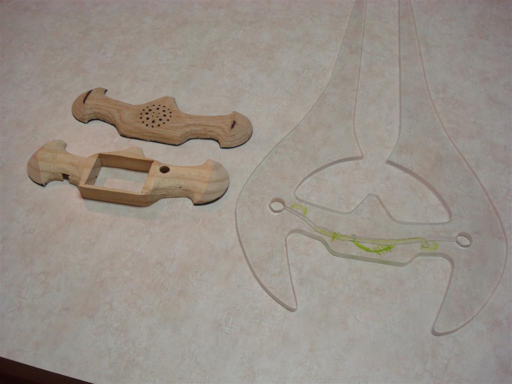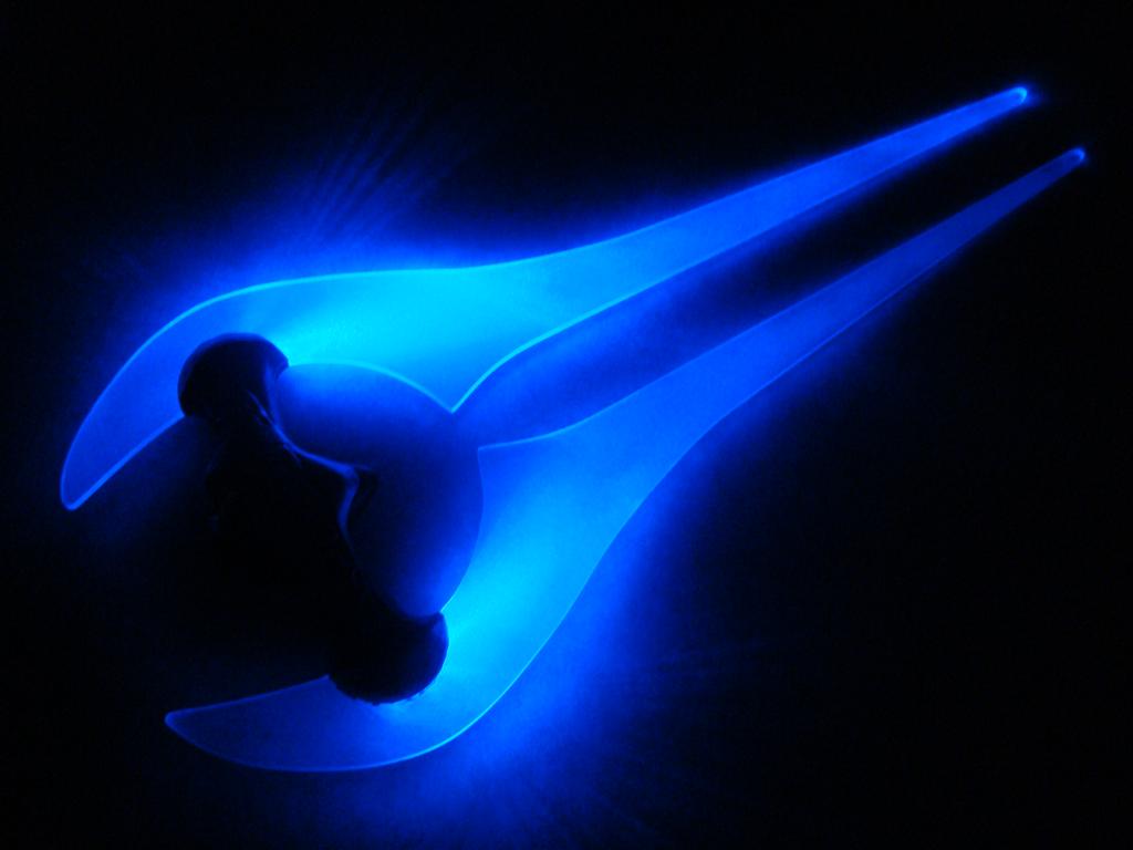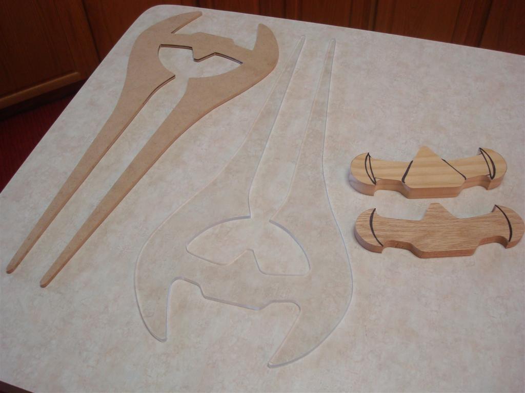 I made this Halo energy sword for my nephew for his birthday. I decided on using an electronic sword to start with because it already had lights, sound and was motion activated. I found a really good one at Toys R Us for 11 bucks. Not bad. I first created my template in the computer plotted it full size. I made it only 21.5" to more closely match the scale of my nephew. I transferred my pattern to 1/4" MDF and cut it out as accurately as I could. I used the wooden template to cut the plexiglass using a flush trim bit on the router table. I sanded one side of the plexi with an orbital sander and 200 grit sandpaper so it would catch the light. I also polished the edges hoping to keep more light in.