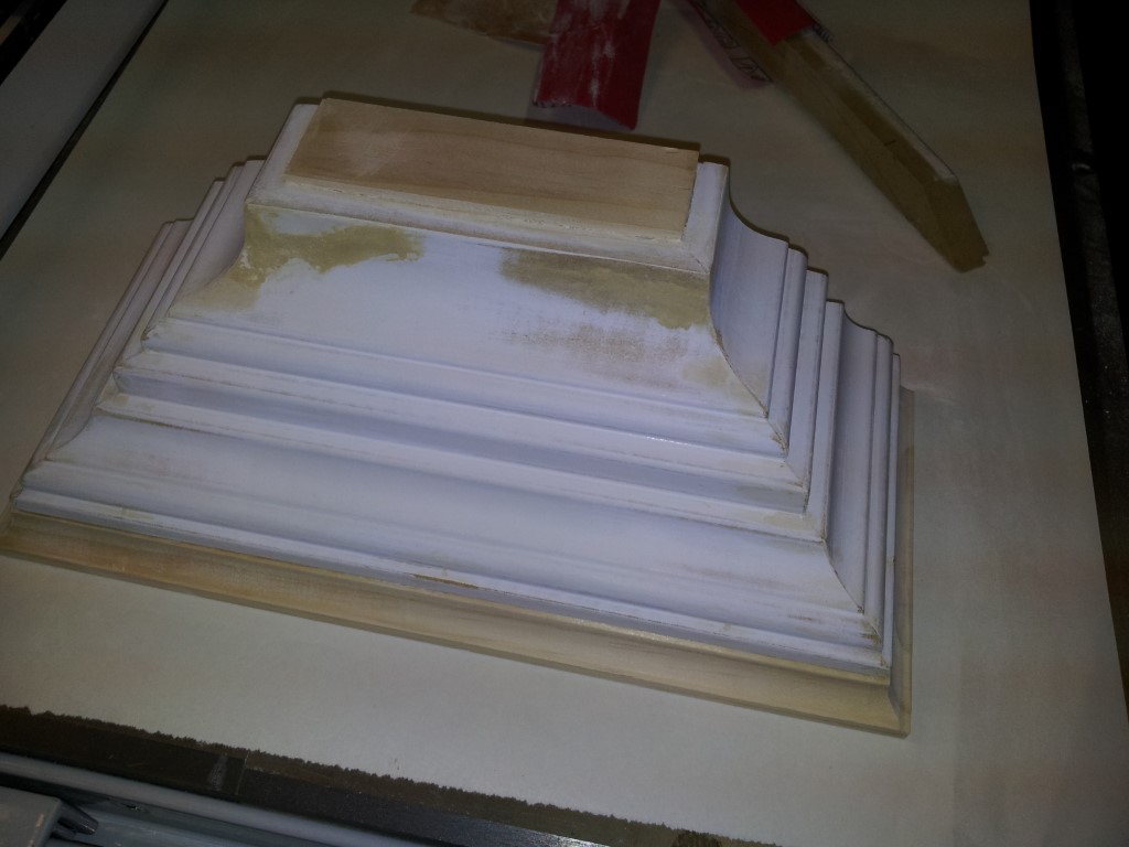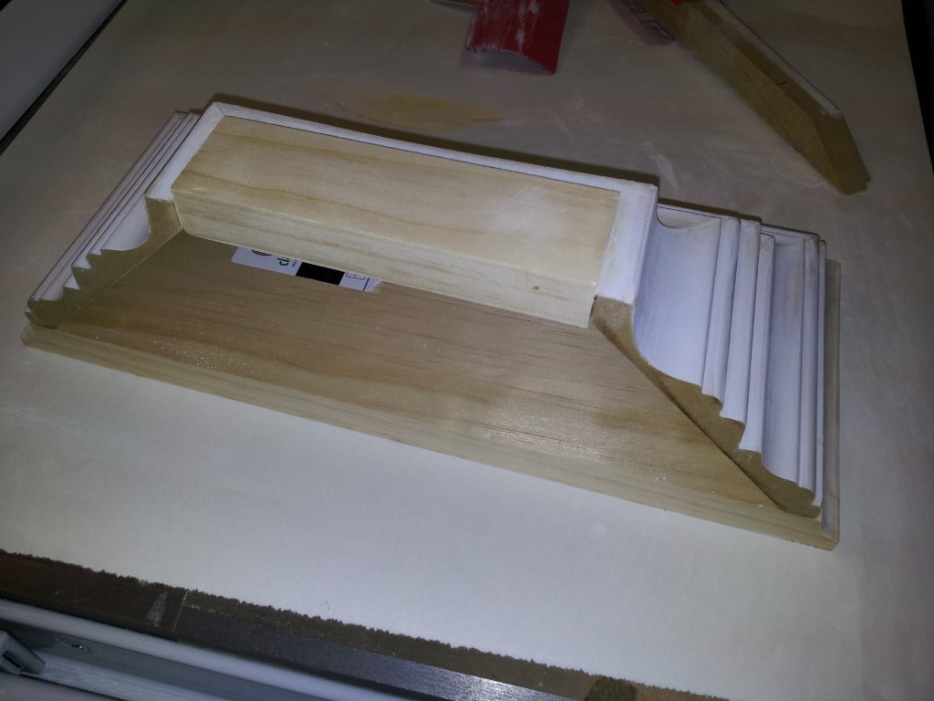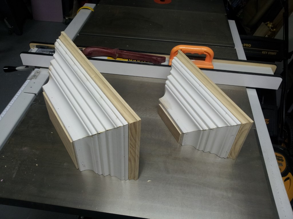I assembled the 5 separate sections in the garage. Then primed, sanded and painted them. Then hung them and filled in the spaces, sanded some more, and touched up. The hardest part was that the room has 135 degree angled walls leading to the door which wasn't so fun trying to cut the crown molding to match. Luckily Dewalt has a chart for compound cuts and crown molding.