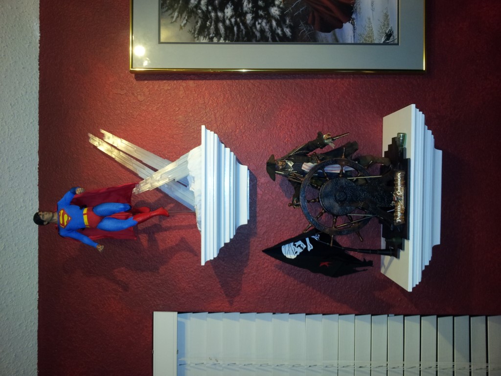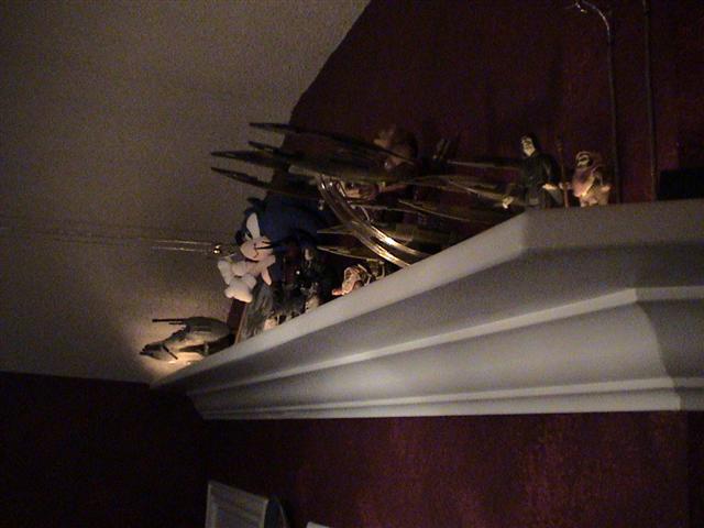 I decided I wanted a shelf for my action figures/toys so I made my own to fit my strangely shaped computer room. I also added some indirect lighting to it to more easily see what's up there.