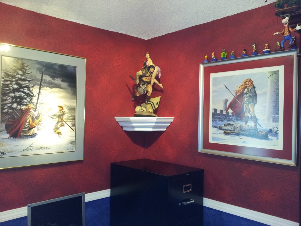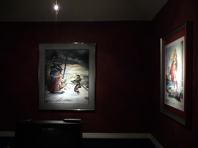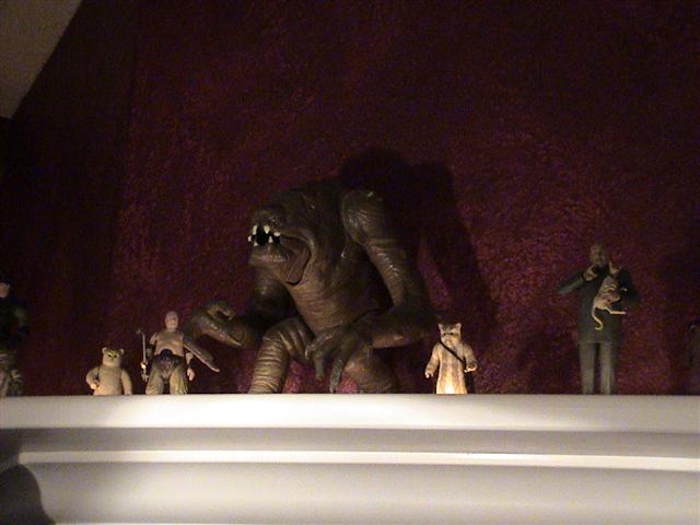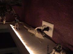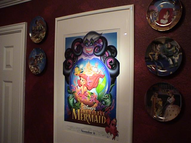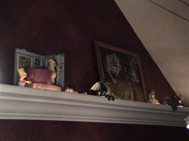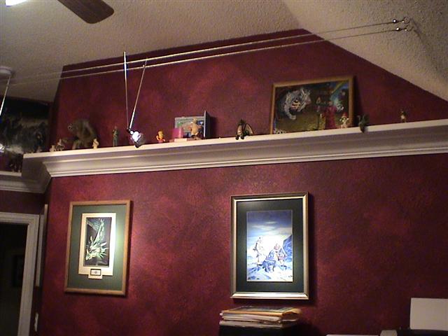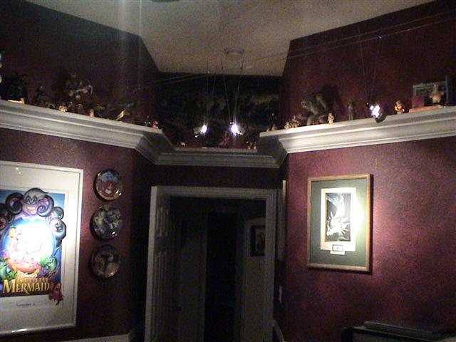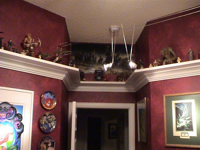 I love the toy shelf!!!! With the subtle lighting of the toys and a few MR16s lighting the artwork, working on the computer is just that much more fun. It's a great addition to the computer room and goes great with my collection of AD&D art and of course my Little Mermaid poster. Definitely a stark contract when compared to Sydney's bright'n happy room just next door.