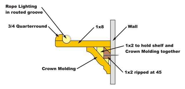I made it with 1x8, 3/4 quarterround, crown molding and 1x2s. I attached it to the walls by ripping 10" sections of 1x2 at a 45 degree angle and attaching the larger half to the wall, the smaller to the shelf and then "hanging" the shelf on the angle.
